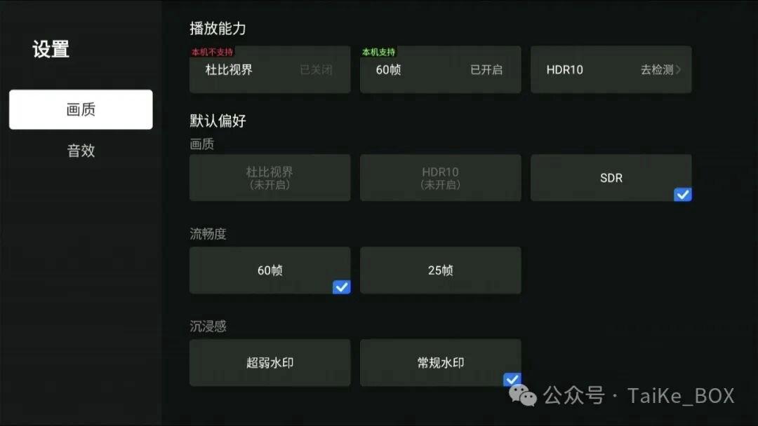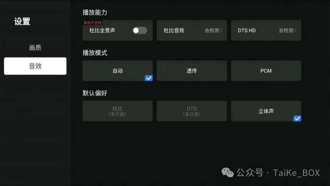 首次打开软件时,可以按提示检测你家设备支持的解码能力,看看是否支持杜比视界,HDR和DTS。