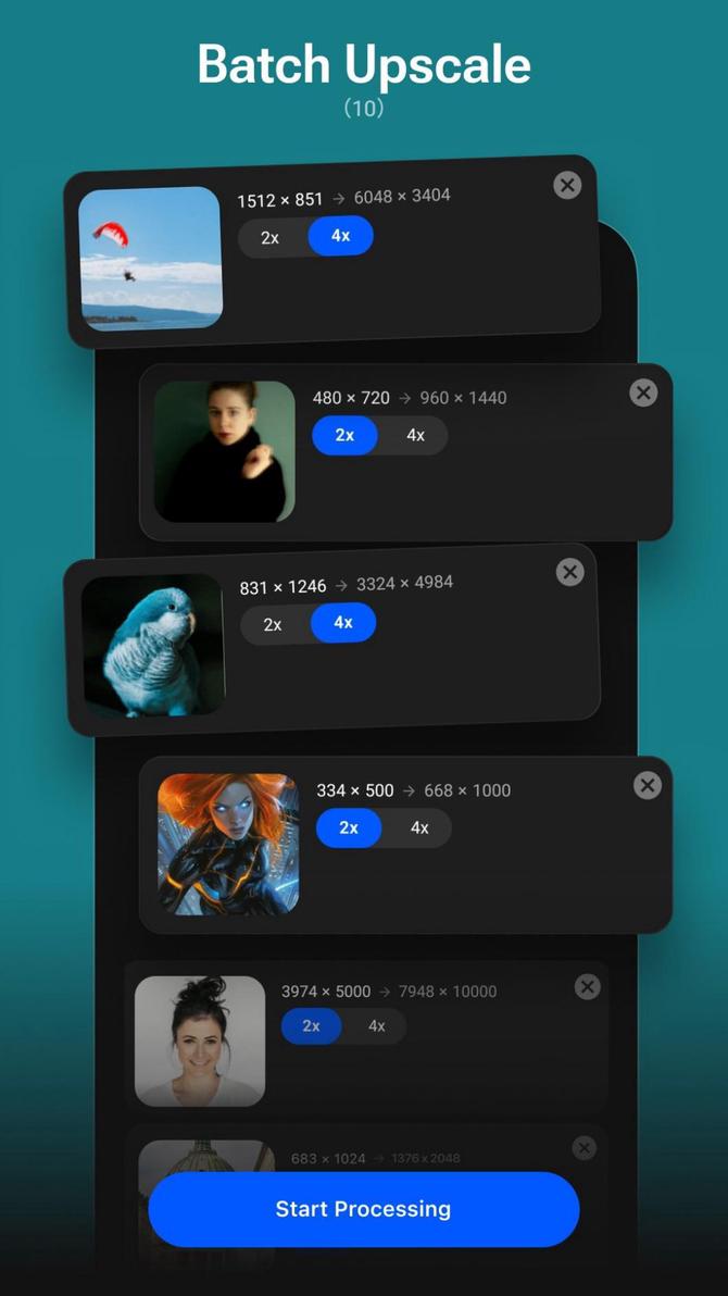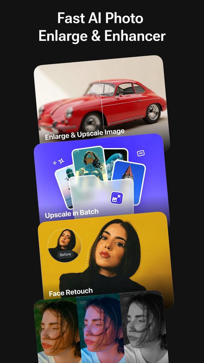 Enlarge photos by 2×, 4×, or 8×, fix blurry images, retouch portraits, and apply professional enhancements — all in one simple and intuitive app.