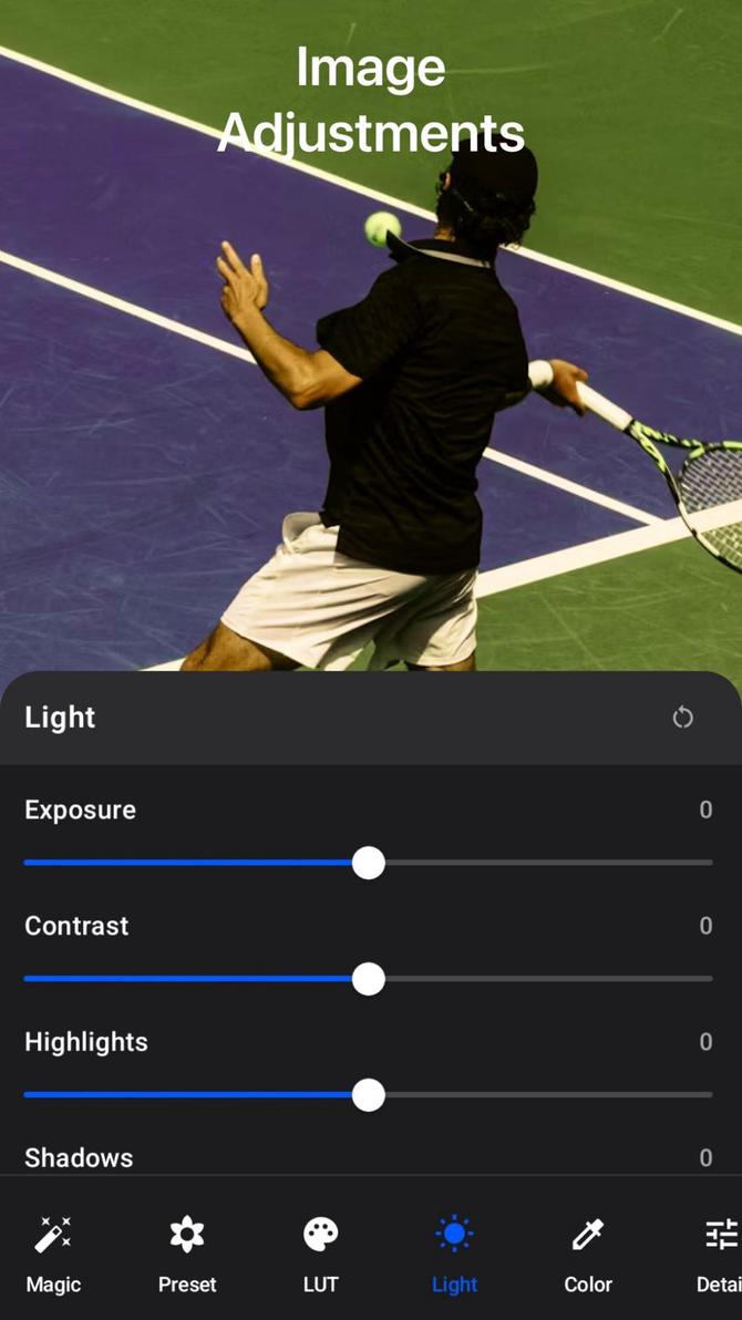 Lighting controls (exposure, contrast, highlights, shadows)