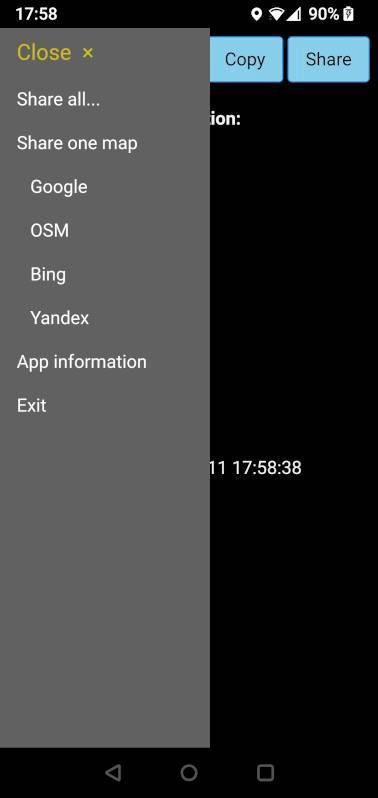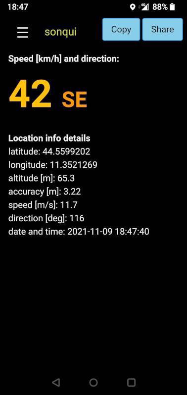 sonqui is a small "one-tap app" for Android sharing quickly geolocation data with map links. It gets the detailed technical geolocation data and generates map links for Google Maps, OpenStreetMap, Bing Maps, and Yandex Maps. It can also be used as a real-time speedometer.