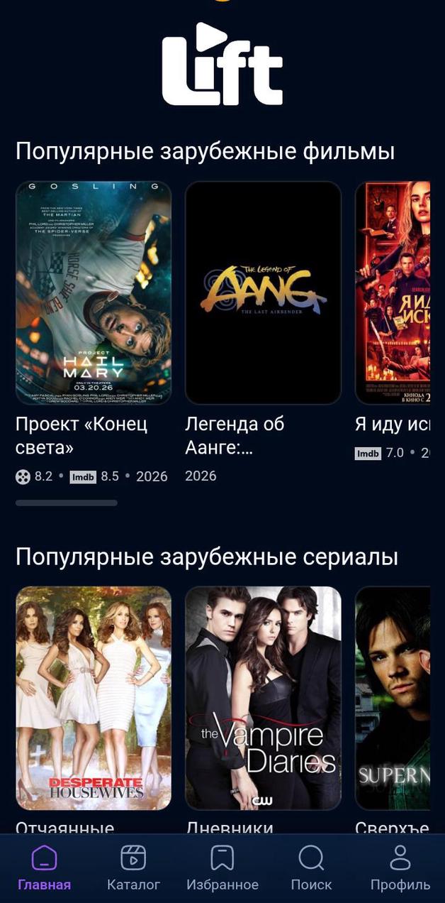 Lift - это удобный онлайн-кинотеатр для Android без рекламы с большой библиотекой фильмов и сериалов.