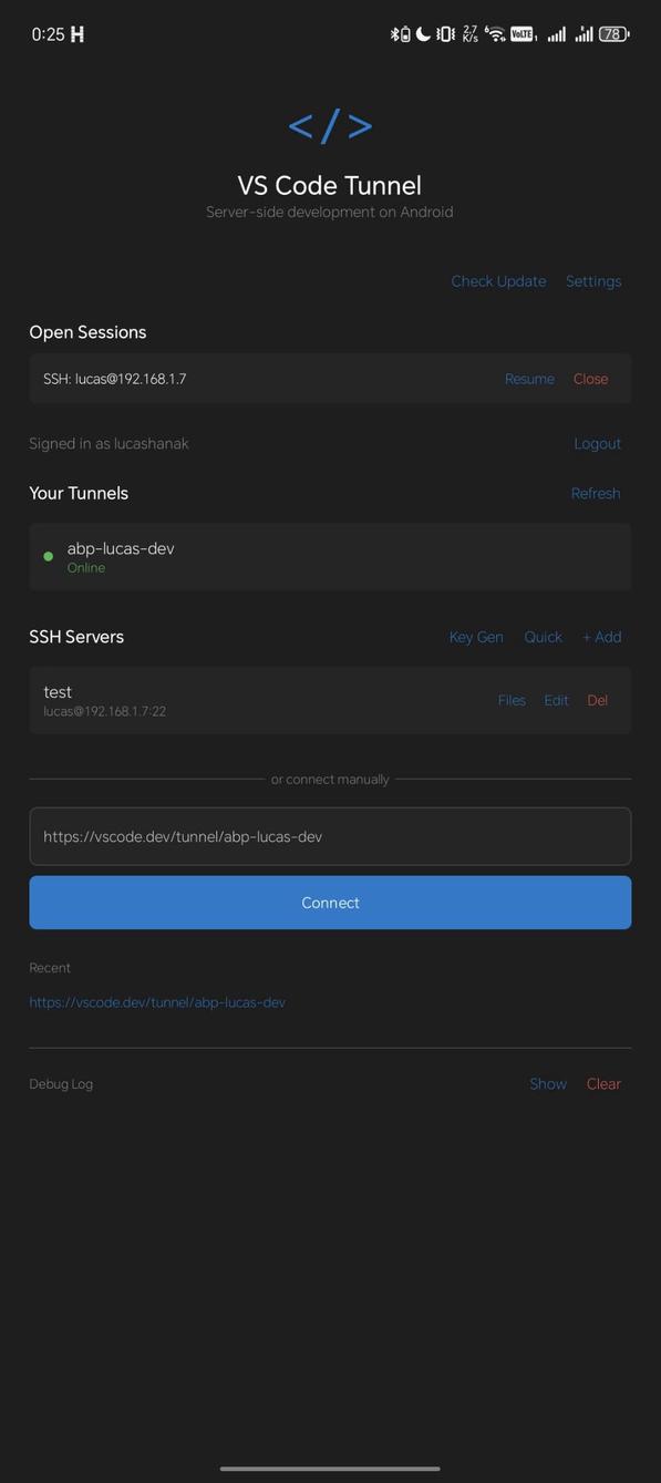 A native Android client for VS Code Remote Tunnels with a built-in SSH client, custom overlay keyboard, and SFTP file browser. Designed for server-side development on phones and foldables.