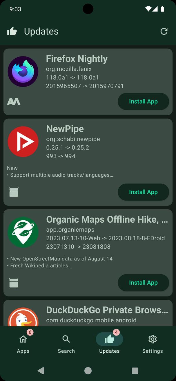 Update Sources: Find updates from APKMirror, Aptoide, F-Droid, IzzyOnDroid, APKPure, GitLab, GitHub and Google Play.
