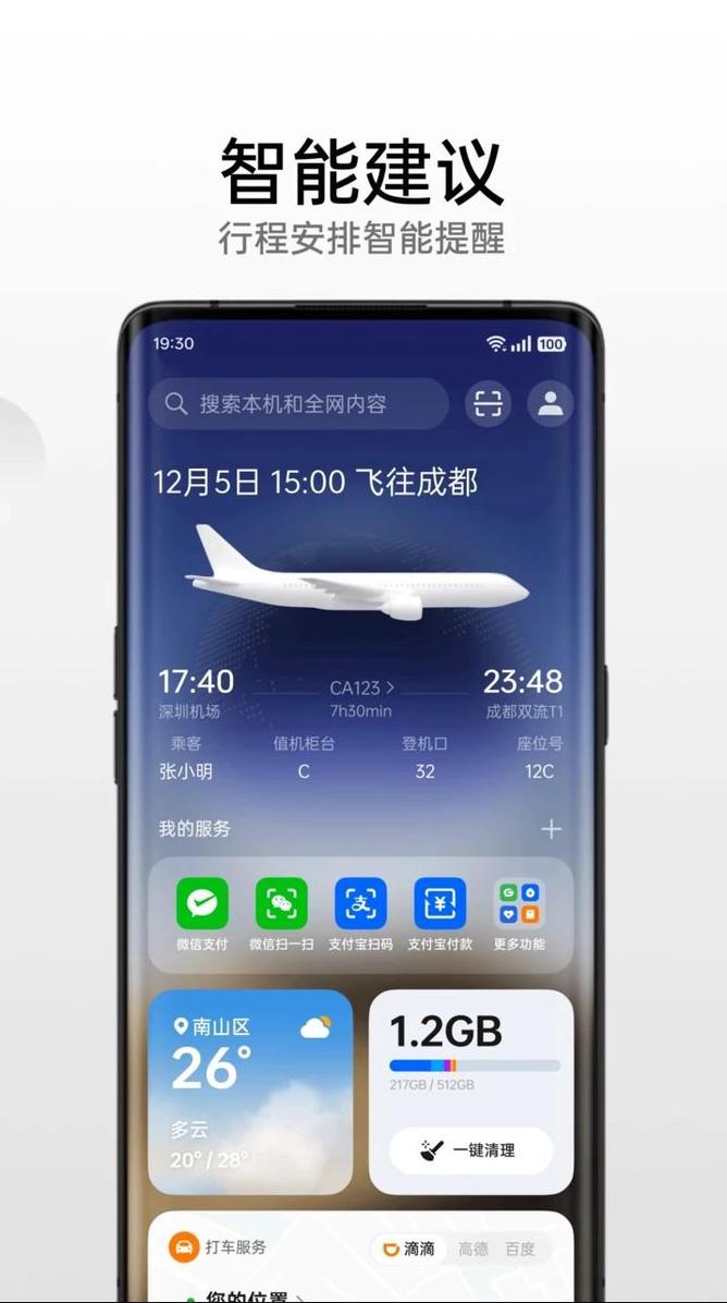 8000万用户喜爱的速览,通过聚合多种功能、内容卡片,实现常用功能一键直达,重要信息一速览。桌面轻轻向右滑动进入负一屏,即可享受更多便捷。【智能建议】基干场景识别,为用户提供涵盖工作、 生活、出行等场景的贴心智能服务。工作—智能提醒当天日程,让你不再遗漏重要安排;记录家和公司位置,为你智能规划通勤路线。出行一智能识别出行场景,为你提供行程管理服务和精选旅游实用信息;更有打车行程服务助你。【内容服务】支持用户快速获取信息,便捷调用常用功能。更有无需下载安装即可使用的快应用。实用信息一运动计步记录你的每日步数;实时展示当天天气信息和股票行情;绑定手机号查询快递物流动态,支持在线寄件;快速查看个人便签和应用使用时长等内容。【快捷功能】“微信支付”、“微信扫一扫”等实用快捷功能一键直达;智能找车记录停车位置,支持一键导航找车;一键呼叫收藏的联系人;