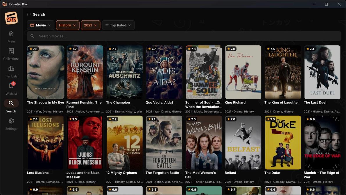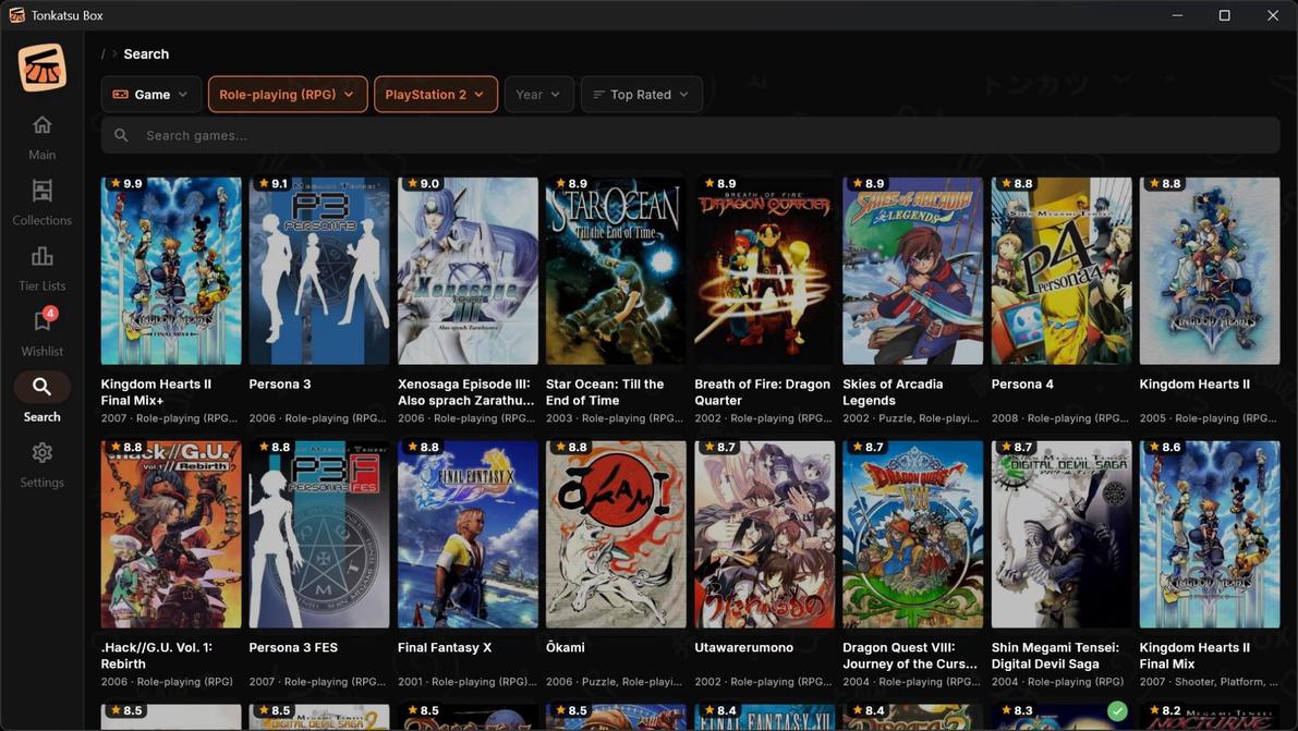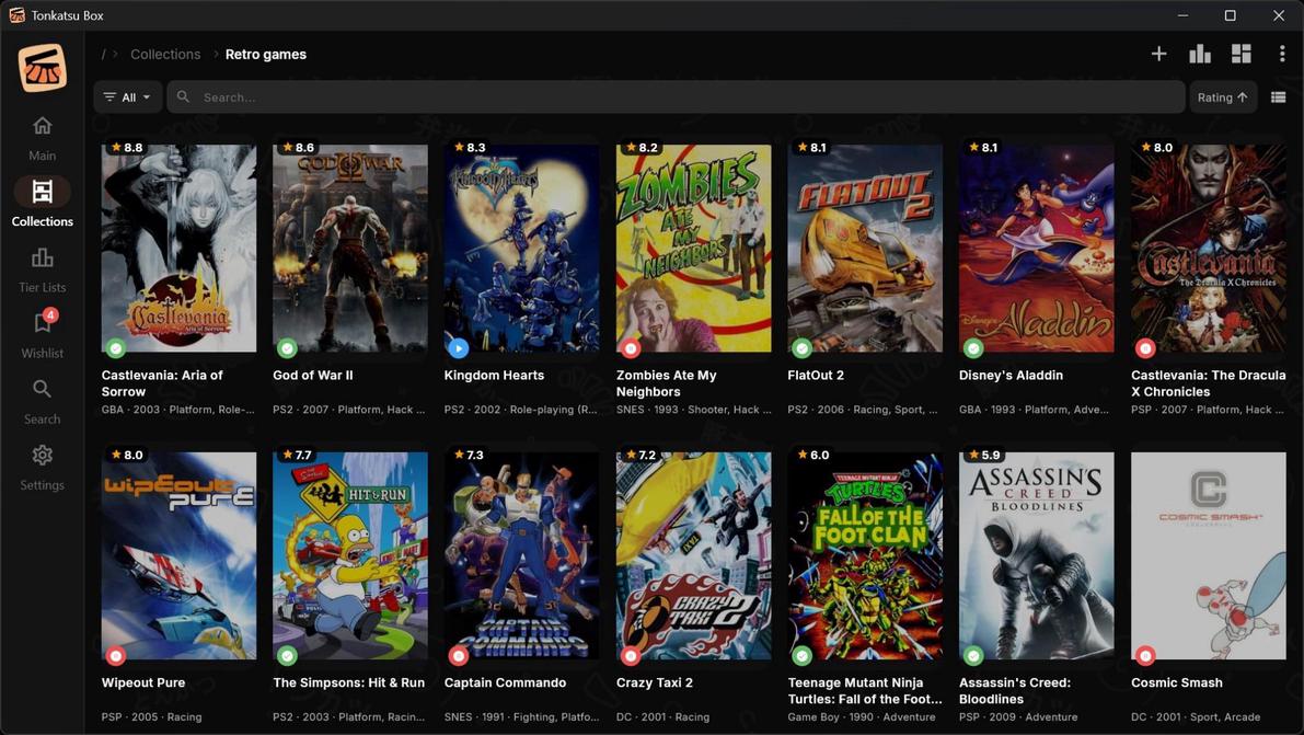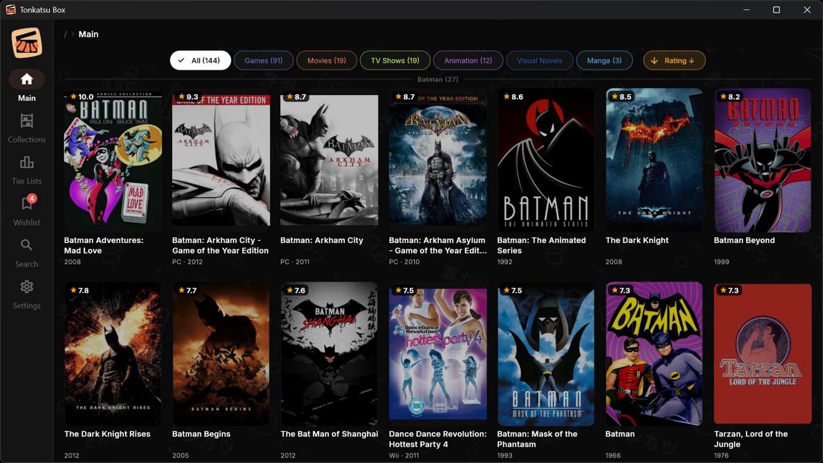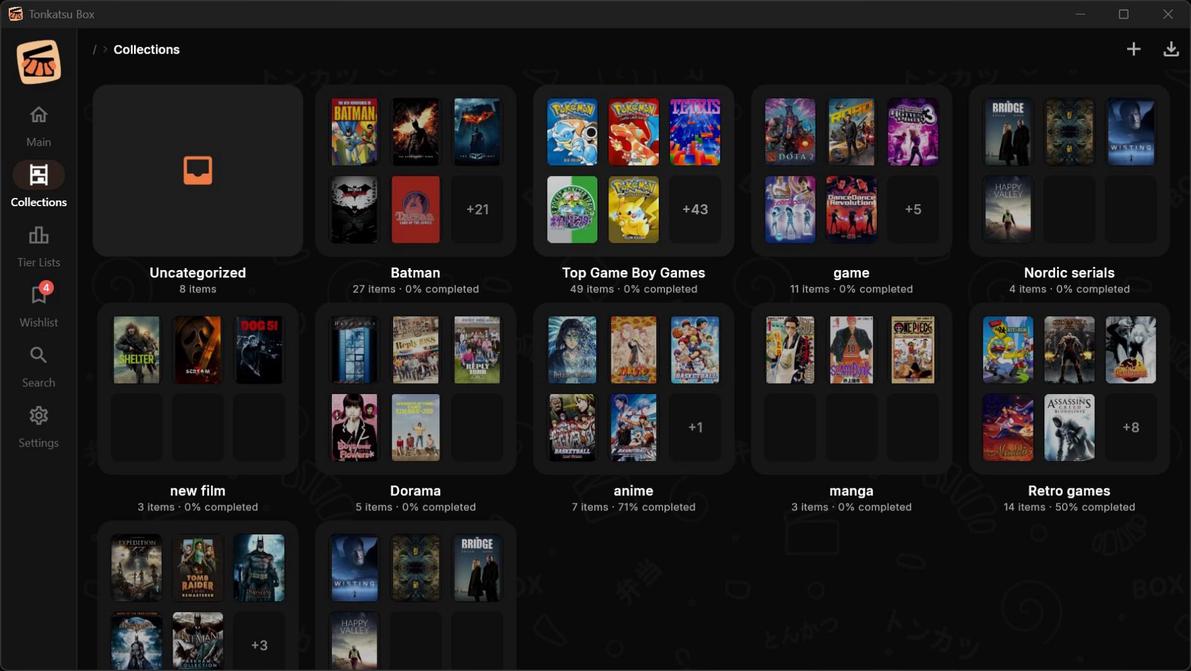 Tonkatsu Box is a free, open-source collection manager for retro games, movies, TV shows, anime, visual novels, and manga. Search IGDB, TMDB, VNDB, and AniList databases with hundreds of thousands of titles, organize them into custom collections, track your backlog and progress, rate everything from 1 to 10, create visual boards with drag-and-drop, import your watch history from Trakt.tv, and share collections with friends. Available for Windows, Linux, and Android in English and Russian.