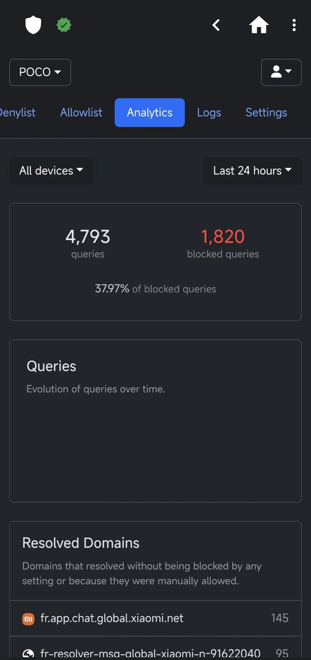 Отслеживает DNS-запросы, заблокированные запросы, события безопасности в режиме реального времени — прямо в приложении.