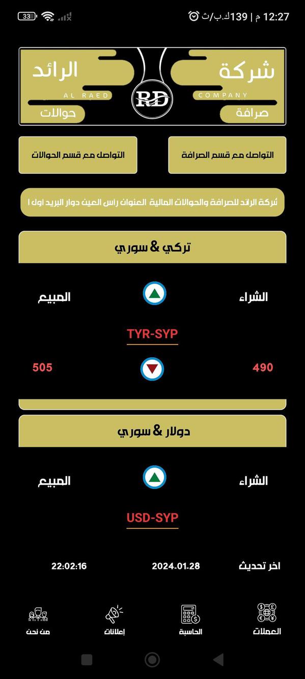 تطبيق شركة الرائد للصرافة لمعرفة سعر الصرف لحظة بلحظة في مدينة رأس العين وماحولها حمله الآن