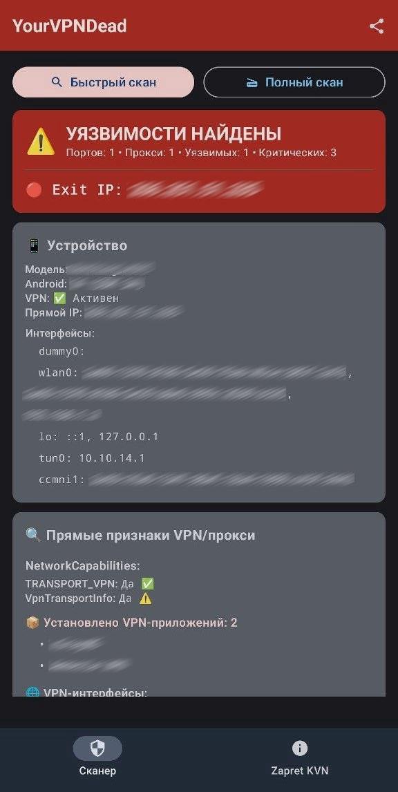 😎 YourVPNDead (твой ВПН мёртв) — теперь ты знаешь об этом Самопроверка на обнаружение VPN/прокси на Android Демонстрирует, какую информацию о вашем VPN может получить ЛЮБОЕ приложение на устройстве — без root, без специальных разрешений, используя только стандартные API Android. Чтобы обнаружить айпи вашего ВПН требуется меньше 1 секунды. Зачем это нужно В 2024-2026 годах Роскомнадзор и Минцифры активно развивают методы обнаружения VPN на устройствах граждан. Методичка Минцифры описывает проверки, которые могут выполняться приложениями, имеющими доступ к устройству (банковские приложения, приложения госуслуг, маркетплейсы с обязательными SDK). Это приложение показывает вам то же самое, что видит потенциальный шпион — чтобы вы могли защититься. Контекст угрозы Яндекс.Метрика с 2017 года отправляет HTTP-запросы на localhost (исследование) Meta Pixel использует WebRTC STUN для сканирования localhost (SDP Munging) Минцифры разработала методику детекции VPN по открытым портам, MTU, DNS, интерфейсам Роскомнадзор блокирует VPN-протоколы на уровне ТСПУ (DPI), но детекция на устройстве — следующий этап Все популярные VPN-клиенты (v2rayNG, NekoBox, Hiddify) создают SOCKS5-прокси без аутентификации на localhost — через него можно узнать IP вашего VPN-сервера Что проверяет приложение 1. Прямые признаки (DirectSignsChecker) Проверка API / Метод Что обнаруживает TRANSPORT_VPN NetworkCapabilities.hasTransport(TRANSPORT_VPN) Системный флаг VPN-транспорта IS_VPN (скрытый) caps.toString().contains("IS_VPN") Внутренний флаг Android, не в публичном API VpnTransportInfo caps.toString().contains("VpnTransportInfo") Класс транспорта VPN HTTP прокси System.getProperty("http.proxyHost") Системный HTTP-прокси SOCKS прокси System.getProperty("socksProxyHost") Системный SOCKS-прокси Известные порты Сравнение с базой (1080, 9050, 8080...) Прокси на стандартных портах VPN-приложения PackageManager.getPackageInfo() 19 известных VPN-клиентов VPN-интерфейсы NetworkInterface.getNetworkInterfaces() tun\d+, tap\d+, wg\d+, ppp\d+, ipsec.* Таблица маршрутизации /proc/net/route Default route через нестандартный интерфейс Split tunnel Сравнение прямого IP и proxy IP Per-app split bypass Проверяемые VPN-приложения (19 пакетов): v2rayNG, sing-box (SFA), Hiddify, ClashMeta, Shadowsocks, HAPP, XrayNG, NekoBox, ByeDPI, ByeByeDPI, Outline, Psiphon, Lantern, WireGuard, strongSwan, Tor Browser, Orbot и другие. 2. Косвенные признаки (IndirectSignsChecker) Проверка API / Метод Логика детекции NET_CAPABILITY_NOT_VPN caps.hasCapability(NET_CAPABILITY_NOT_VPN) Если capability отсутствует — сеть = VPN MTU аномалии NetworkInterface.getMTU() VPN снижает MTU (1500→1400) из-за инкапсуляции DNS в частной подсети LinkProperties.getDnsServers() DNS 192.168.x.x/10.x.x.x = возможен VPN-туннель dumpsys vpn_management Runtime.exec("dumpsys ...") Системная информация о VPN (обычно заблокирована) dumpsys VpnService Runtime.exec("dumpsys ...") Активные VPN-сервисы MTU — почему это работает: Стандартный MTU (Ethernet/WiFi): 1500 WireGuard: обычно 1420 (overhead 80 байт) OpenVPN: обычно 1400 (overhead ~100 байт) VLESS/Trojan (xray): 1380-1400 (зависит от транспорта) Если MTU < 1500 на активном интерфейсе — вероятно VPN 3. Анализ /proc/net/tcp (ProcNetScanner) Парсит /proc/net/tcp и /proc/net/tcp6 для обнаружения listening-портов на localhost. Работает без root на большинстве Android. Идентификация VPN-клиента по паттерну портов: Порт Клиент 10808 + 10809 + 19085 v2rayNG / XrayFluent (xray SOCKS + HTTP + Stats API) 2080 NekoBox / Throne (sing-box mixed) 7890 + 7891 + 9090 Clash / mihomo (HTTP + SOCKS + API) 3066 + 3067 Karing 19090 sing-box Clash API (утечка IP серверов через /connections!) 4. Bypass-проверки 4.1 Сканер портов (PortScanner) Сканирует 127.0.0.1 и ::1 (IPv6 localhost). Некоторые VPN-клиенты слушают только на IPv6. Быстрый скан: 40+ известных портов VPN-клиентов Полный скан: 1-65535, 32 параллельных корутины Определение типа: SOCKS5 (RFC 1928), HTTP CONNECT, gRPC (HTTP/2)