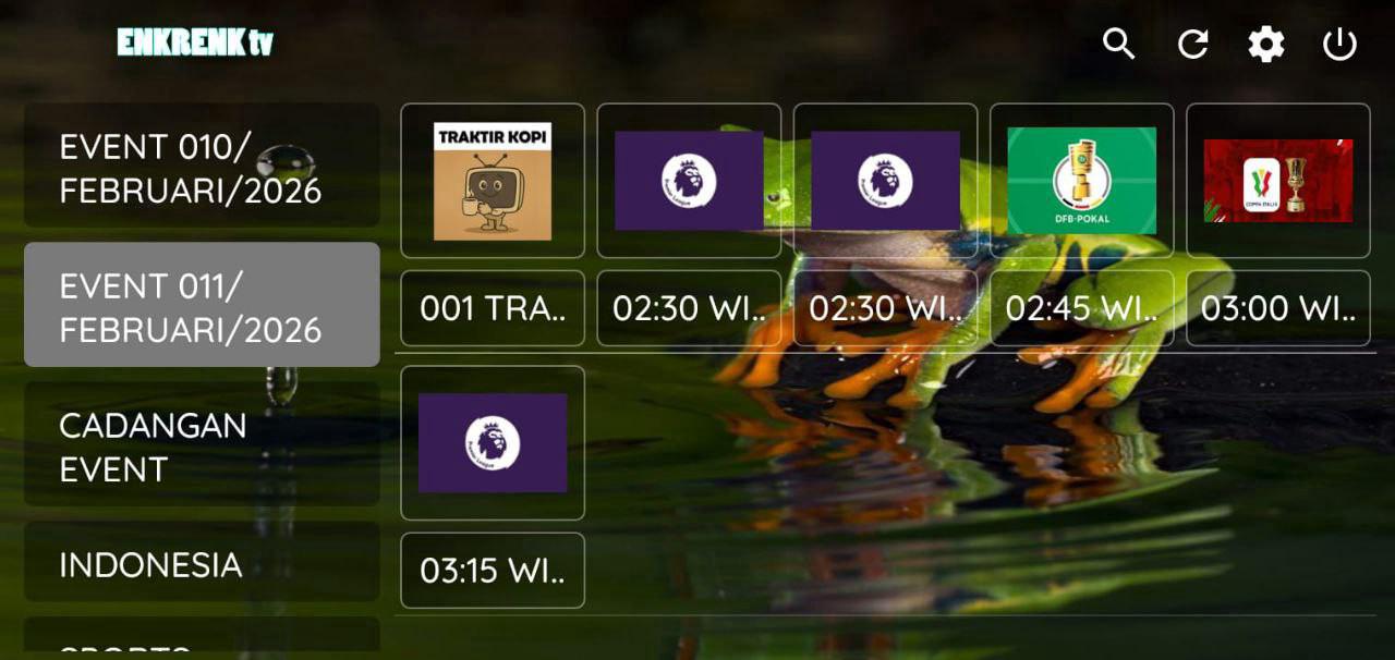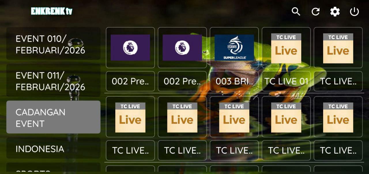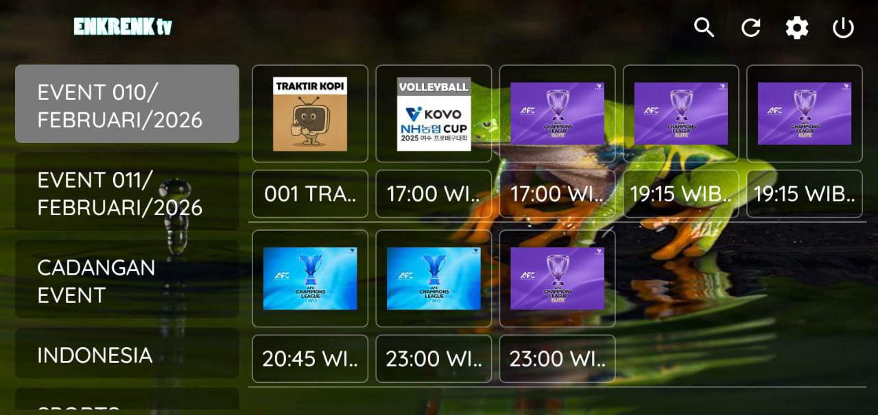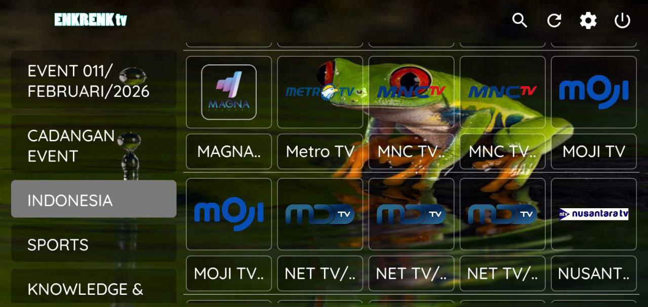 📺 ENKRENK tv – Unlimited Entertainment in One App 🎉 Enjoy thousands of local 🇮🇩 and international 🌍 TV channels, sports ⚽🏀🏎️, movies 🎬, music 🎵, and radio 📻 all in one place. With a modern interface and unique nature-inspired visuals 🐸, ENKRENK tv delivers a fresh and exciting viewing experience. ✨ Key Features - 📡 Complete Channels: Indonesia, Malaysia, Brunei, and global networks. - 🏆 24/7 Sports: Premier League, Bundesliga, La Liga, F1, UFC, and more. - 🎬 Movies & Series: Local favorites and international blockbusters. - 🎵 Music & Radio: Stream your favorite songs and radio stations directly. - ⏰ Live Event Schedule: Real-time updates for matches and events. - 🌿 Unique Interface: Stylish backgrounds with nature-inspired visuals. 🎯 Why Choose ENKRENK tv - 👍 Easy navigation and user-friendly design. - 👨‍👩‍👧‍👦 Suitable for all ages and entertainment needs. - 🔄 Regular updates with new channels and events. - 📱 One app for all your entertainment.