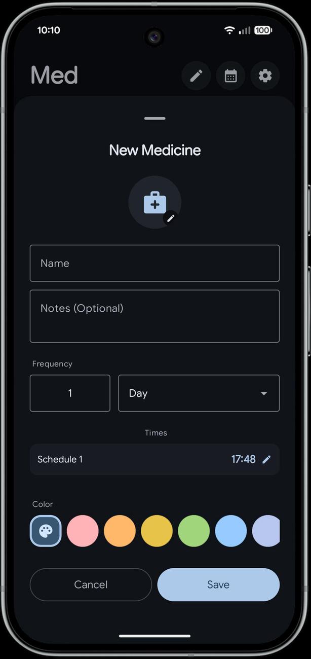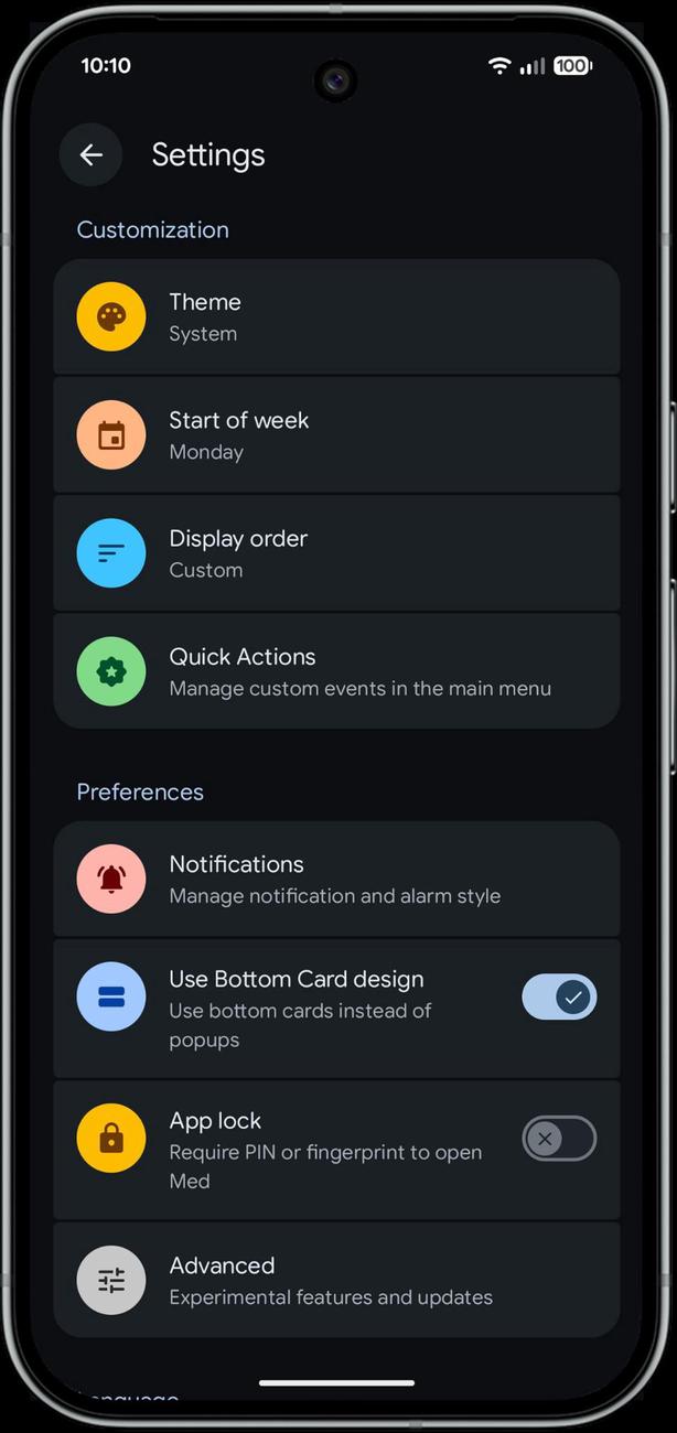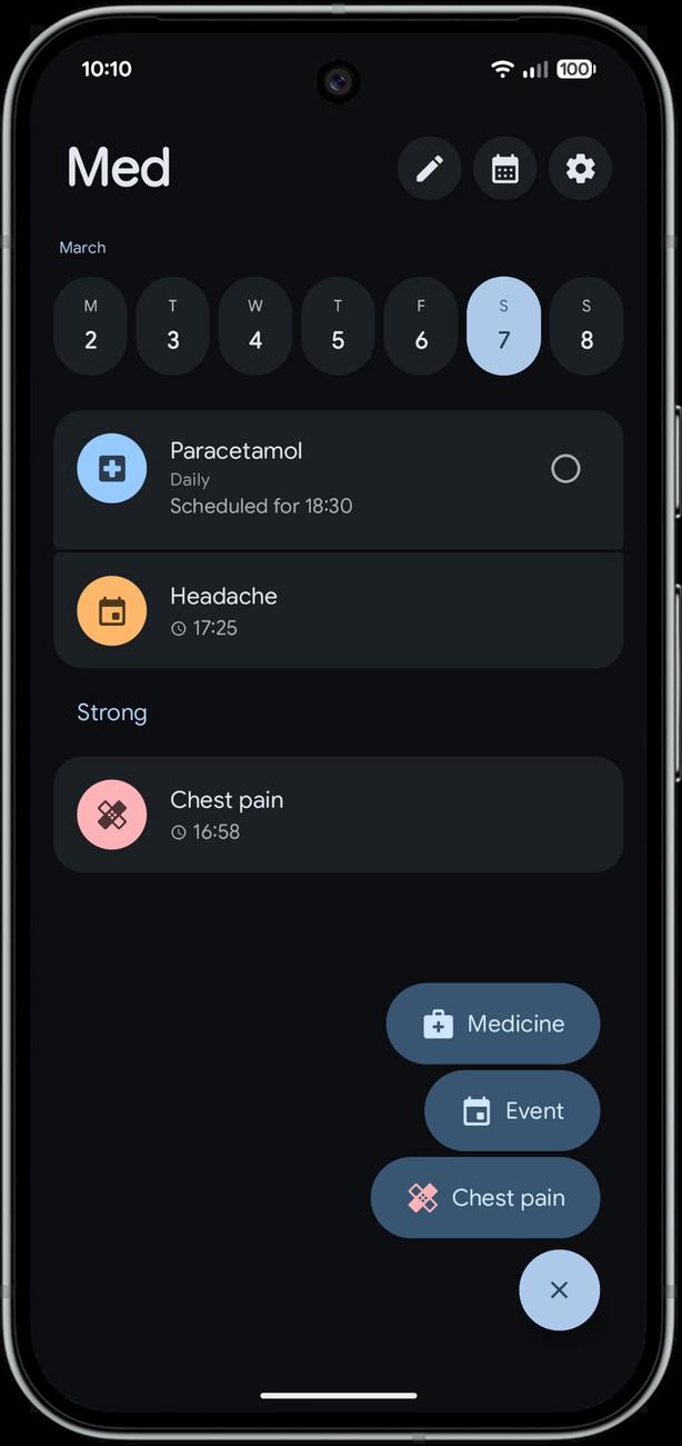 Пользовательский интерфейс разработан в строгом соответствии с последними рекомендациями Material 3 Expressive с использованием Jetpack Compose, что обеспечивает чистоту, плавность и современный вид приложения. Хотя при разработке приоритет отдавался эстетике Pixel и AOSP , приложение безупречно работает на любом устройстве Android 8+. Med отлично работает на любом устройстве, будь то обычный телефон, складной смартфон или планшет.
