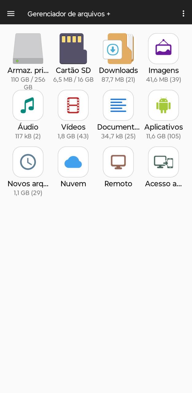 • Armazenamento principal: Você pode gerenciar todos os arquivos e pastas no armazenamento do seu dispositivo.