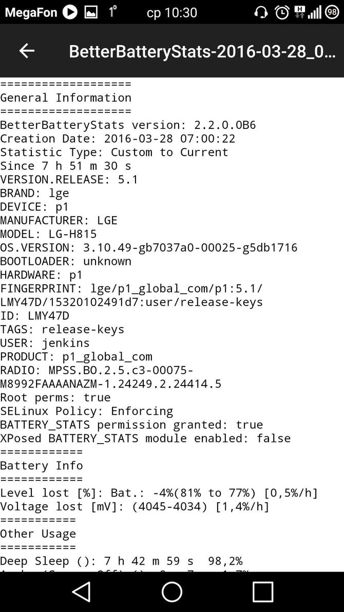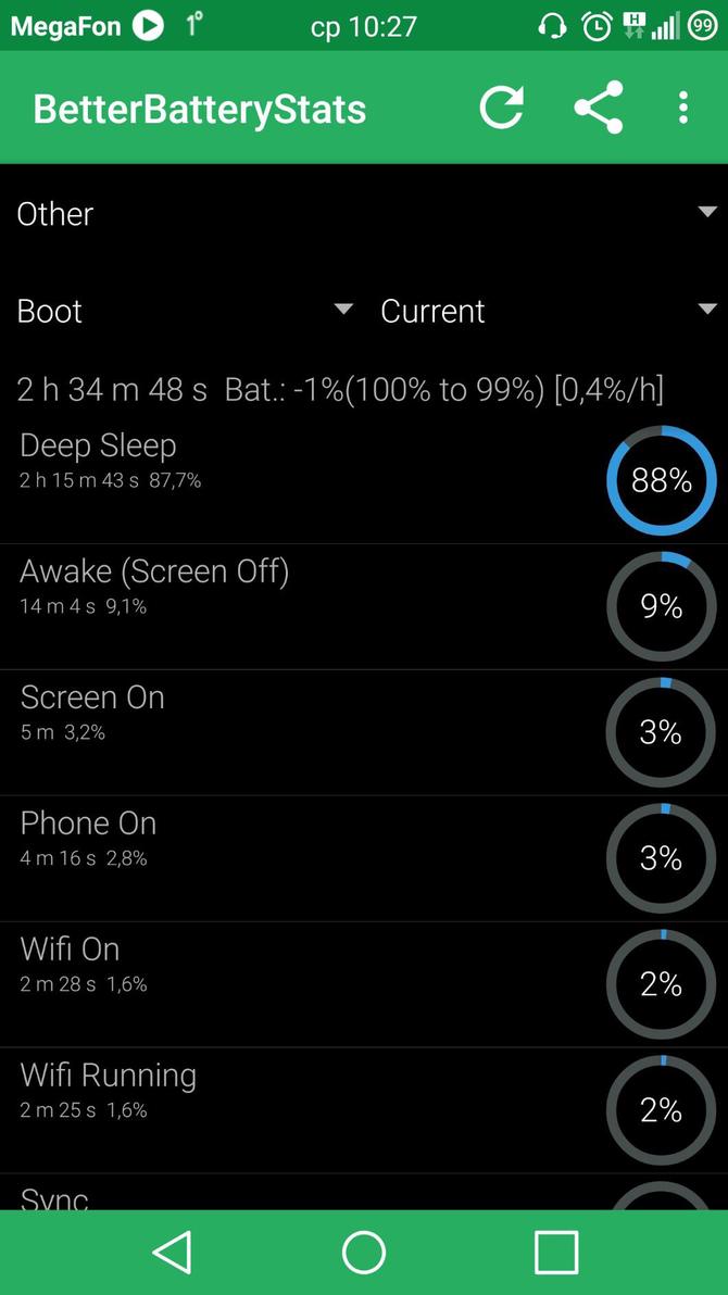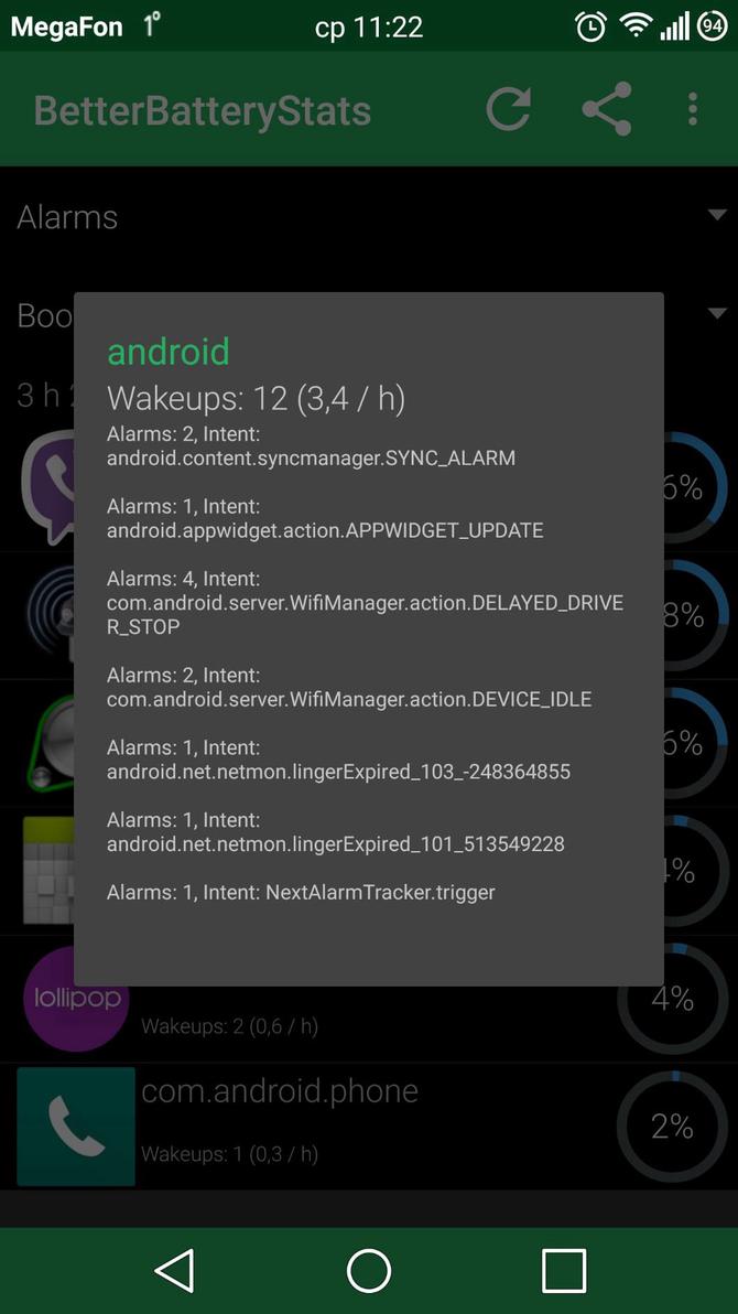 С этим приложением Вы сможете проанализировать, какие приложения расходуют заряд аккумулятора тогда, когда телефон должен бездействовать, а также просмотреть подробную информацию о потребителях энергии.