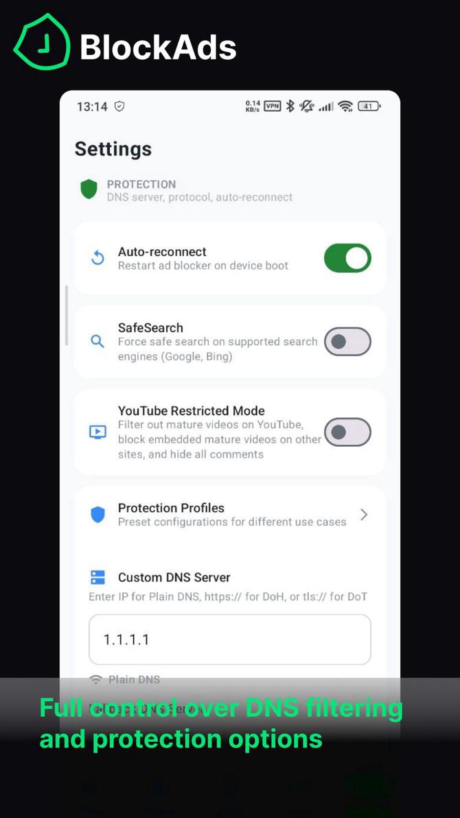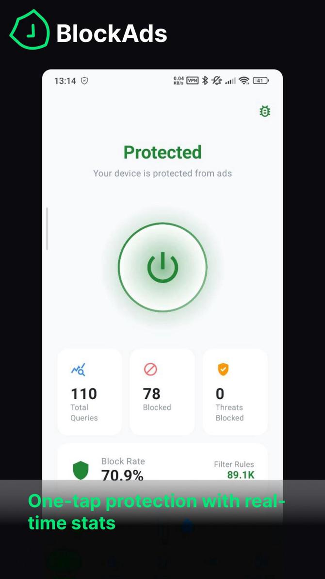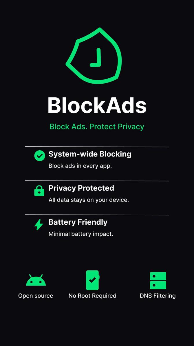 It blocks ads, trackers, and malware system-wide using local VPN-based DNS filtering — no root required, no data collection.