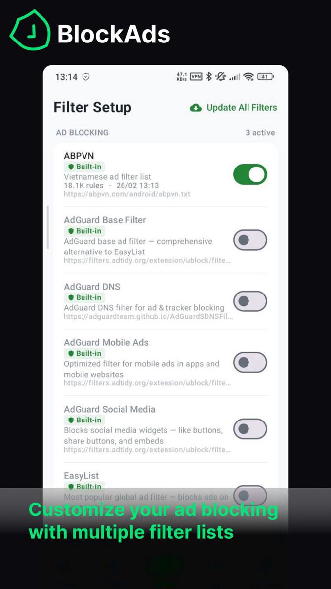BlockAds creates a local VPN on your device. DNS queries are routed through it and matched against filter lists using a memory-efficient Trie data structure. Matching queries are blocked locally. All other traffic passes through normally — no data leaves your device.