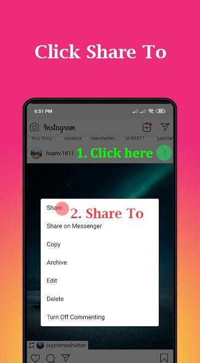 2. Click the 3-point icon and select "Share To". And choose app Inst Saver: Post & Story Saver