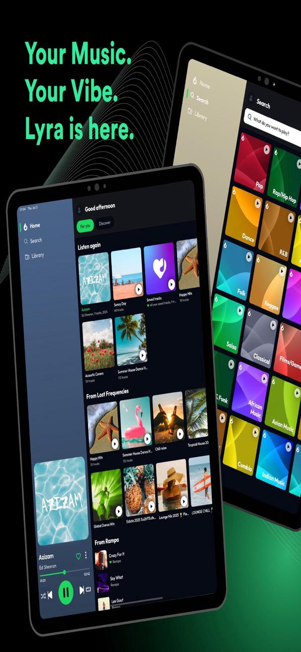 Stream millions of tracks, create your own playlists, and vibe with a beautiful, lightning-fast interface. Lyra is your companion for every mood, workout, party, and moment of calm.