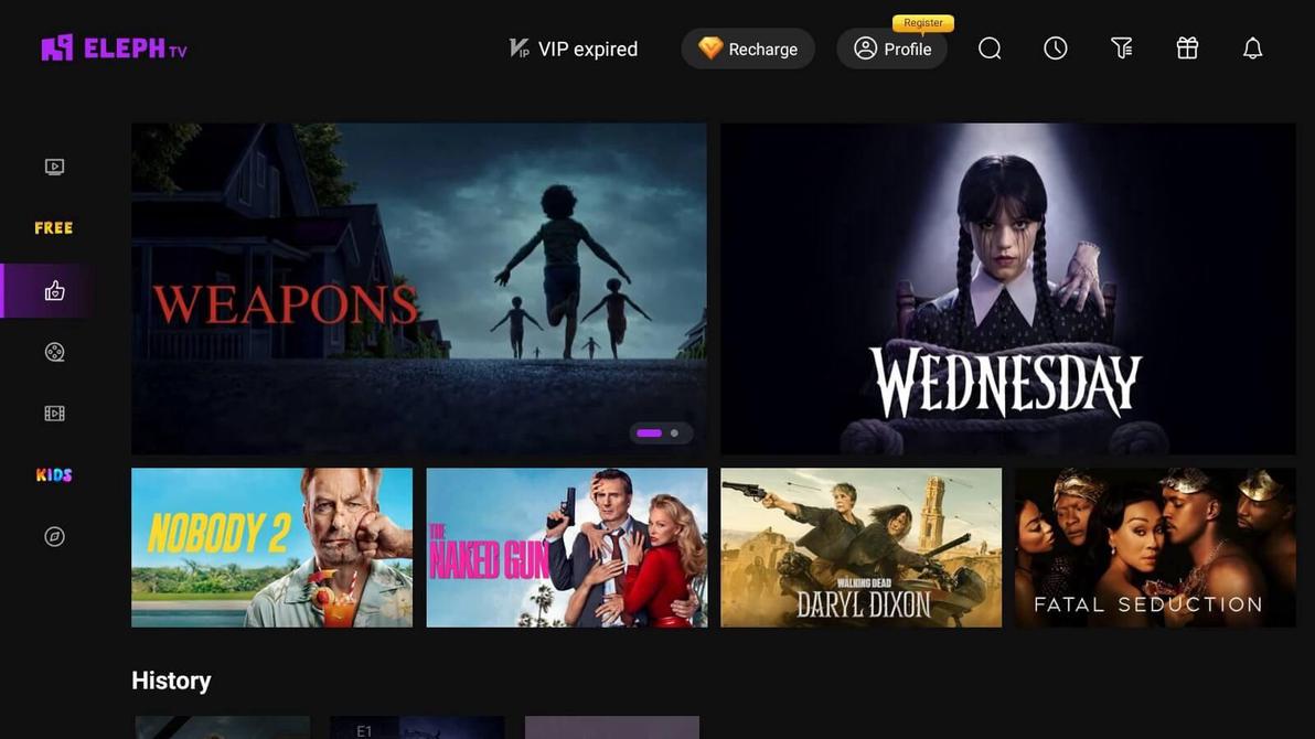 • ElephTV is a streaming application that offers a vast library of content, including movies, series, live channels, and family-friendly shows, with over 100,000 VODs and 400+ live channels available.