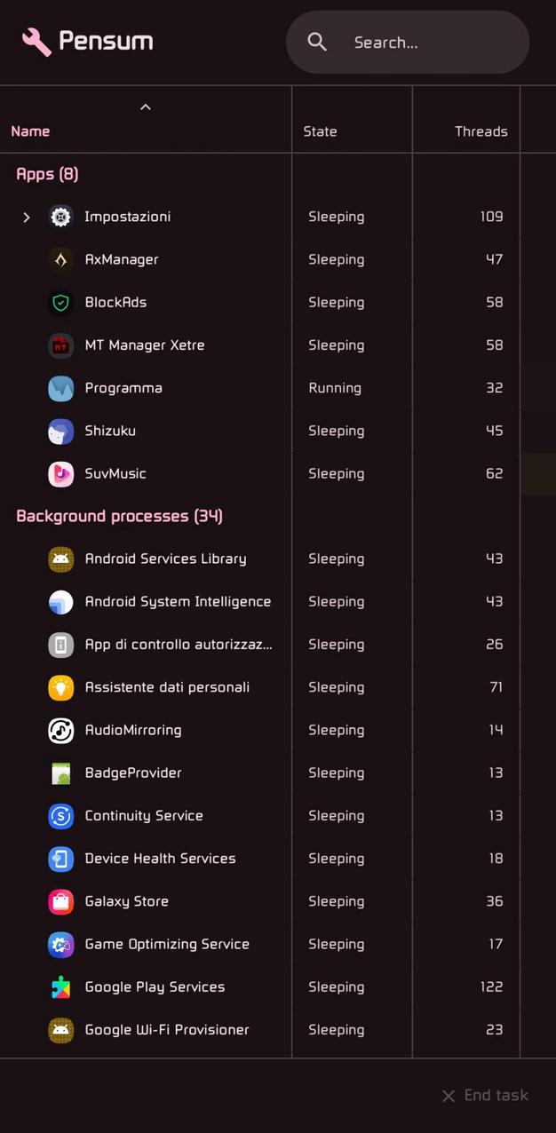 Real-time Monitoring: Live updates of CPU and RAM consumption across system and user processes. Grouped View: Organized categorization of Apps, Background processes, and Android system processes. Desktop Mode Optimized: Built to run in windowed mode with a responsive layout for desktop-style multitasking with full keyboard and mouse support. Planned Features: Resource History: Real-time system resource graphs (CPU/RAM history).