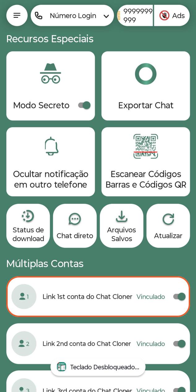 Clone conversas de outros usuários em seus dispositivos, escaneie QR Codes da web e sincronize o chat no celular. 1. Features ✔Sync Chat messages by scanning Chat QR Code ✔ Read & Access others Chat from your device ✔ Link & Clone 5 different Chat Accounts ✔ Link anyone's Chat Account ✔ Link Device that is far away from you ✔Hide "Logged In" Notification from Linked device ✔ Become Offline to others while being online ✔ Download and Upload Files on Linked Accounts ✔Get "New Message" Notification ✔Block Keyboard Switch ✔Share Chat QR Code This App lets you Clone and Read different Chat Accounts on your Phone. You can add Up to 5 different Chat accounts on your phone. You have the option to read chat without sender knowing. Protect your family by keeping eye on their Chat with Chat Cloner App. With the dual chat cloner app you can login and use multi chat accounts which means you can use parallel chat accounts on one phone at the same time. The dual chat feature allows you to use multiple accounts to send and receive messages and chat with your friends and family. Elevate your chat experience with dual chat and many other features. The QR code scanner & generator allows you to scan and create QR code providing you with the best experience for QR scanning. Never miss out any status update of your contacts, you can download and save any status and share it with others. With the Direct Chat feature, say goodbye to the hassle of saving contact numbers, you can send messages and chat with anyone without saving their number to the contacts. This app is similar to parallel space, dual space, multiple accounts, parallel accounts, 2 accounts. 🔸Disclaimer • It is an independent application and is not affiliated, associated, authorized, endorsed by, or in any way officially connected with the official WhatsApp application or WhatsApp Inc. • It is a standalone application and its features and services are distinct from those offered by WhatsApp. • We strictly abide by the data privacy protection policy and will never collect your personal information for any purpose.