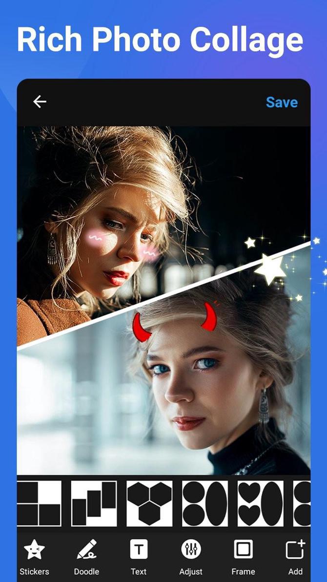 * Add stickers, filters, text, backgrounds, doodles and mosaic, or adjust the brightness, contrast, saturation, and layout of your photos.