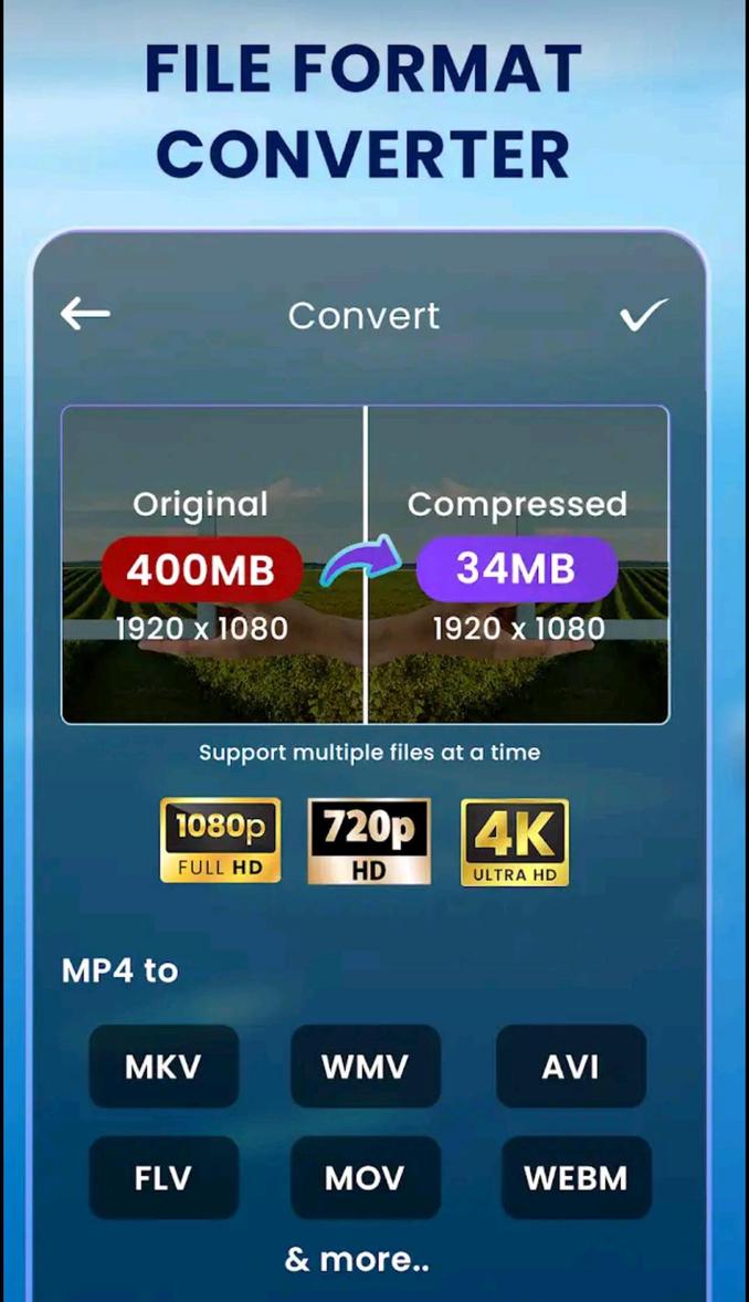 🔄 Besides using it as a video mp4 compressor, you can also convert videos to other formats, images, gifs. There available many video formats such as MP4, AVI, MOV, FLV, MKV, WMV, WEBM, 3GP, F4V, TS, etc. Simply select videos from your gallery and select the File Format Converter, Video to Image, or Video to Gift converter tools from the homepage.