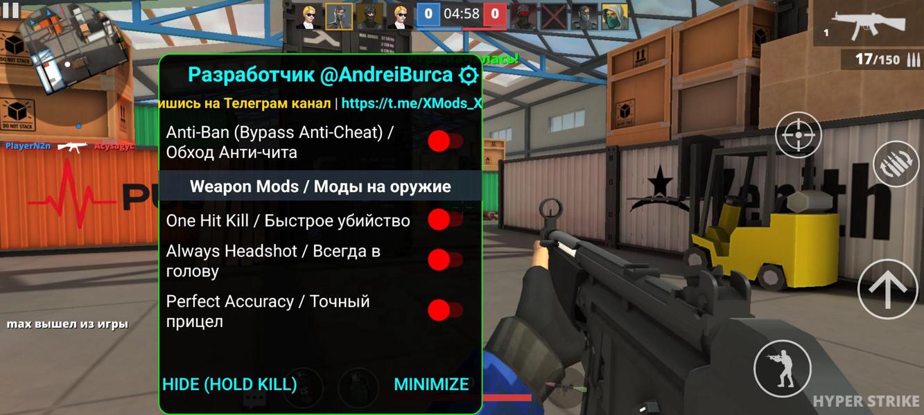 ​🛡️ Anti-Ban (Bypass) / Обход анти-чита ​💀 One Hit Kill / Быстрое убийство ​🎯 Always Headshot / Всегда в голову ​🎯 Perfect Accuracy / Точный прицел ​ исключительно только для (64bit) Оцените приложение если понравится сделаю обновление и добавлю ещё больше возможности в меню Hyper Strike PVP FPS Советую включить Быстрое убийство Обход анти-чита Точный прицел Для более эффективности