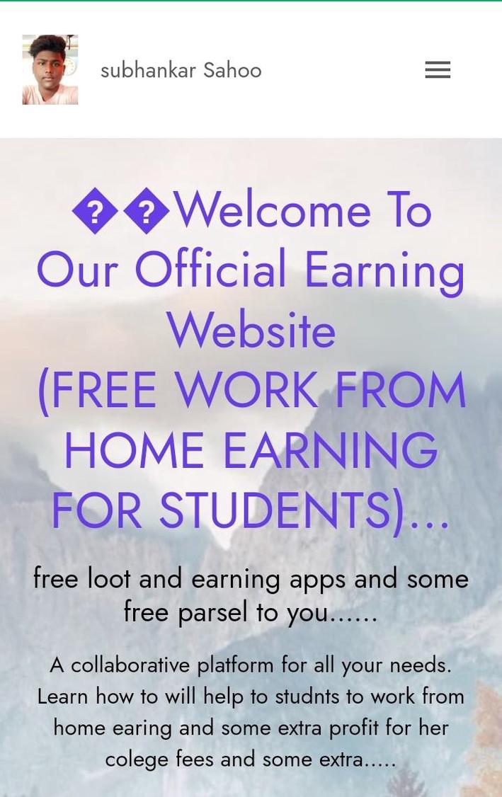 Welcome To Our Official Earning Website (FREE WORK FROM HOME EARNING FOR STUDENTS)β¦ free loot and earning apps and some free parsel to you...β¦ A collaborative platform for all your needs. Learn how to will help to studnts to work from home earing and some extra profit for her colege fees and some extraβ¦.. GET FREE PRODUCTS WITH YOUR COUSTOM NAME;- Click Here To Free Sample Linkβ¦. This is a paragraph. You can write your own name here and fill in the blanks. and this is delevery to your address arround 3 to 4 weeks Get Started Nowβ¦.. SAMPLE LINK Get Started GET