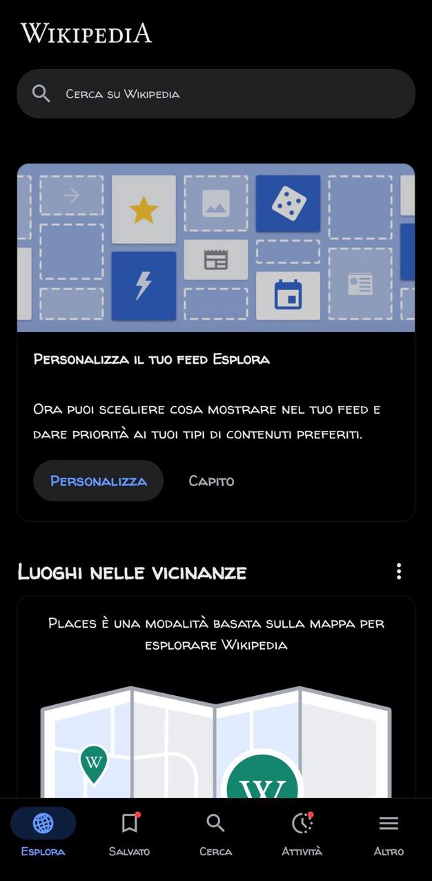 Feed Esplora: Contenuti di Wikipedia consigliati tra cui eventi attuali, voci popolari, eventi del giorno nella storia, voci suggerite in base a ciò che hai già letto, e altro ancora. Il feed Esplora è completamente personalizzabile — basta selezionare i tipi di contenuti che si desidera vedere, o modificare l'ordine in cui compaiono i diversi tipi di contenuti.
