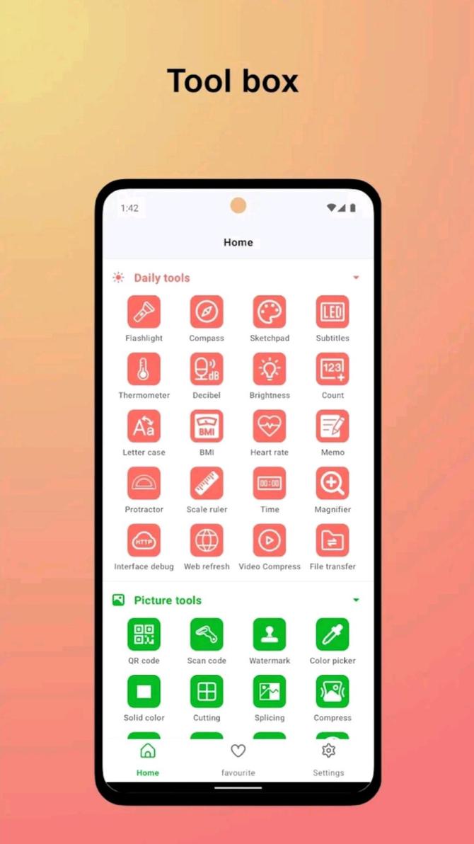 Daily tools include (flashlight, compass, drawing board, memo, LED subtitles, decibel detection, light detection, thermometer, body index calculation, heart rate detection, protractor, ruler, time display, magnifying glass, web page timer refresh, http interface test, video compression, file transfer, etc.)