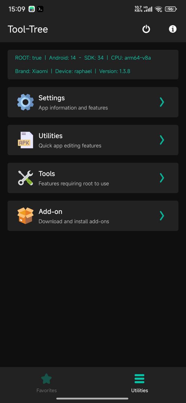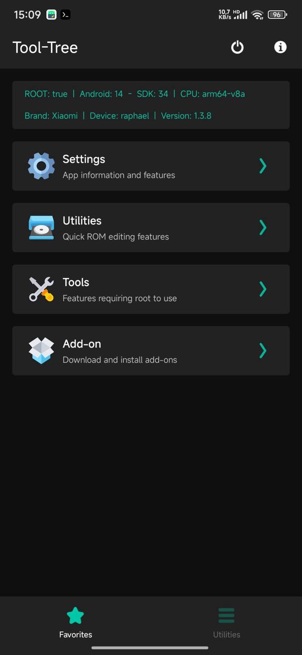 Unpack and repack ROMs and APKs for Android. Tool-Tree supports both root and non-root versions, but works only on arm64 architecture. See details: - No-Root instructions: https://zenlua.github.io/Tool-Tree/website/Guide.html - If the app has root privileges, it runs faster. You can copy the path directly from the log for quick access. Download add-ons: - ROM Editor add-on: https://zenlua.github.io/Tool-Tree/add-on/Addon.html - APK Editor add-on (Apkon): https://zenlua.github.io/Tool-Tree/add-on/Apkon.html Add-on instructions: https://zenlua.github.io/Tool-Tree/website/Instruct.html Related sources: - Many other resources exist but can't be listed here. Only the app framework source is available. - References and source code: - ColdWindScholar: https://github.com/ColdWindScholar - Kr-Script: https://github.com/helloklf/kr-scripts - Termux: https://github.com/termux/termux-app