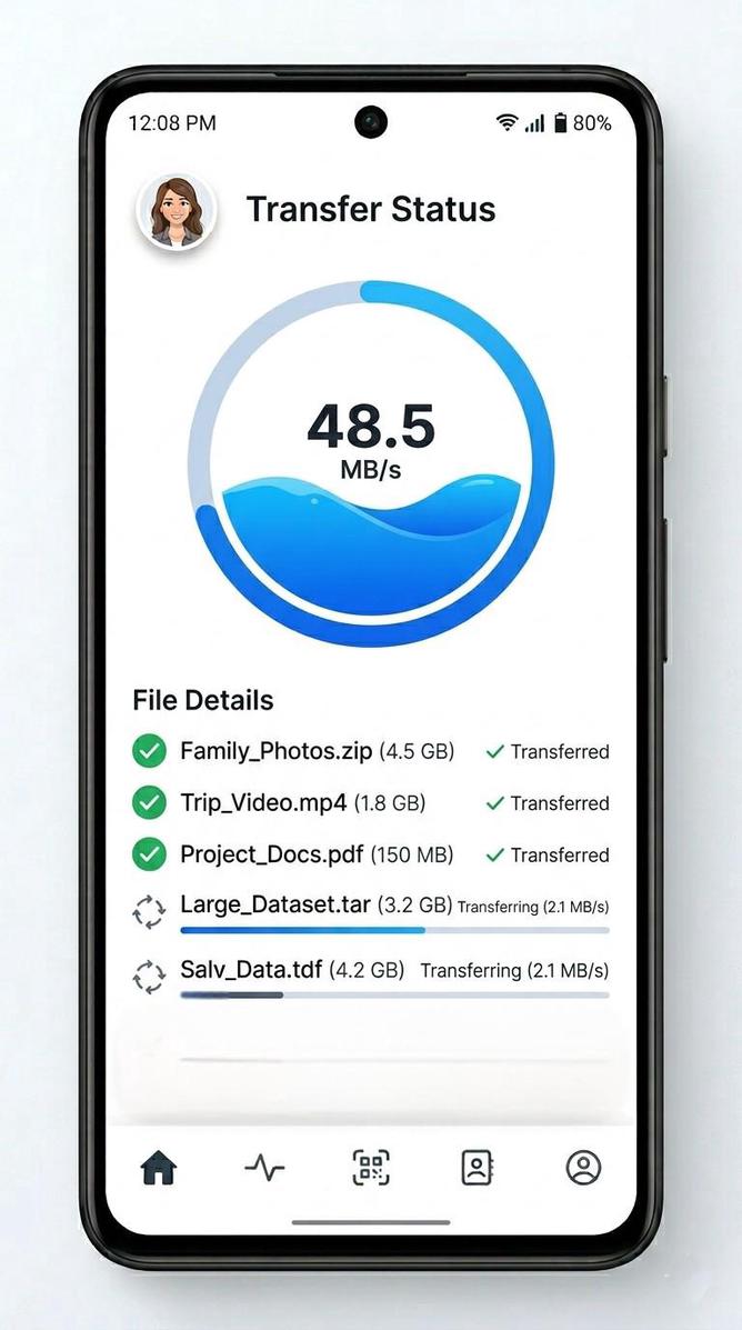 Transfer files much faster than traditional Bluetooth. Send large files in seconds without waiting.