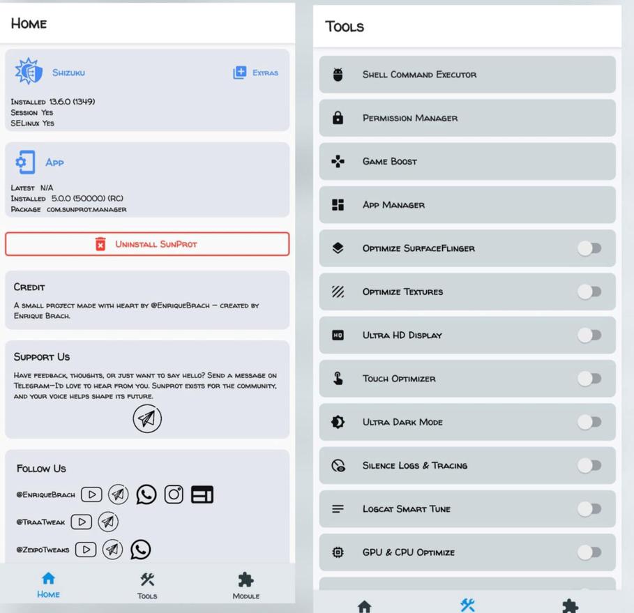 SunProt is a system utility for Android developed by Enrique Brach, focused on enhancing device control, customization, and performance. This repository includes three variants, each tailored to different environments and user needs