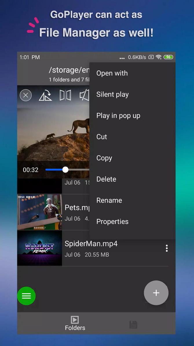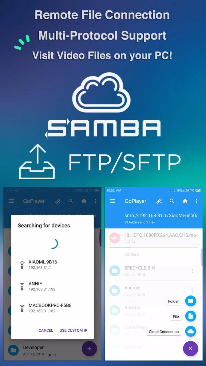 GoPlayer is the most multifunctional, beautiful, and completely free professional video player that allows you to watch multiple videos at the same time and supports all video formats, and it also has a variety of very practical file management functions. It can also play video resources of your Desktop/PC devices within the same network thorough SMB/FTP protocol, which is very convenient and easy to use. You can also share your phone's file within the same network by using the FTP server function. And moreover its exclusive Pnlink technology enables you to watch massive online video resources. GoPlayer is definitely the best choice for you to enjoy videos on Android phones and tablets!