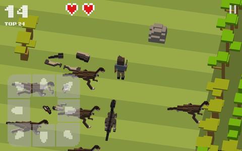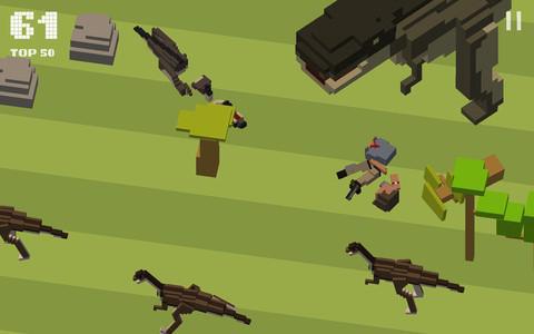 Jurassic Hopper es un arcade de plataformas que toma prestada la fórmula del genial Crossy Road (también disponible para descargar desde Uptodown), y le añade algunas novedades para crear una experiencia de juego diferente, en la que destaca la presencia de los famosos dinosaurios de las películas de Jurassic Park. La mecánica de Jurassic Hopper es simple: con la parte derecha de la pantalla podremos mover a nuestro personaje por el escenario, teniendo en cuenta que el objetivo es llegar tan lejos como sea posible. Mientras tanto, con la parte izquierda de la pantalla podremos atacar. Este ataque dependerá en gran medida del personaje que estemos utilizando en ese momento, ya que cada uno tiene un arma distinta.