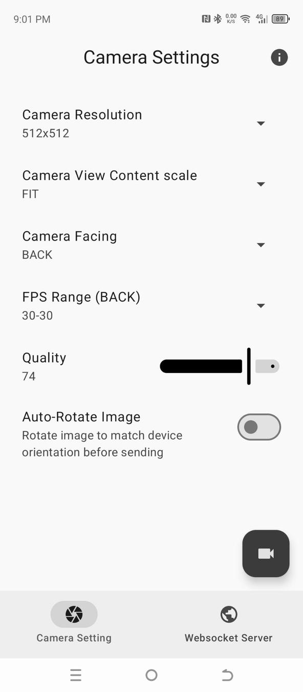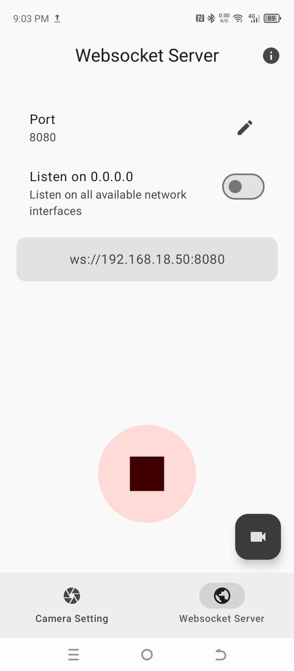 Easily access your device's camera using a WebSocket client API to perform real-time AI and computer vision tasks on a live video stream. The app broadcasts live camera frames as JPEG images over WebSocket connections, allowing multiple clients to connect concurrently and perform AI or computer vision processing in parallel. Displaying the live camera stream using Python A simple Python example using OpenCV and WebSocket libraries to connect to the WebSocket CAM app and display the live camera stream. pip install opencv-python numpy websocket-client import cv2 import numpy as np import websocket SERVER_URL = "ws://192.168.18.50:8080" def on_message(ws, message): # Convert received bytes into a numpy array np_arr = np.frombuffer(message, np.uint8) frame = cv2.imdecode(np_arr, cv2.IMREAD_COLOR) if frame is not None: cv2.imshow("Camera Stream", frame) if cv2.waitKey(1) & 0xFF == 27: # ESC key to exit ws.close() cv2.destroyAllWindows() else: print("Failed to decode frame") def on_error(ws, error): print("WebSocket error:", error) def on_close(ws, close_status_code, close_msg): print("Connection closed:", close_status_code, close_msg) cv2.destroyAllWindows() def on_open(ws): print("Connected to WebSocket CAM. Open the camera to see the live stream.") if __name__ == "__main__": websocket.enableTrace(False) ws = websocket.WebSocketApp( SERVER_URL, on_open=on_open, on_message=on_message, on_error=on_error, on_close=on_close, ) try: ws.run_forever() except KeyboardInterrupt: print("\nStopped by user") ws.close() cv2.destroyAllWindows() Start the WebSocket server in the app, then run this Python script in multiple terminals to view several live streams simultaneously. Examples Working examples of this app are available here: https://github.com/UmerCodez/WebsocketCAM-examples License GNU General Public License v3.0
