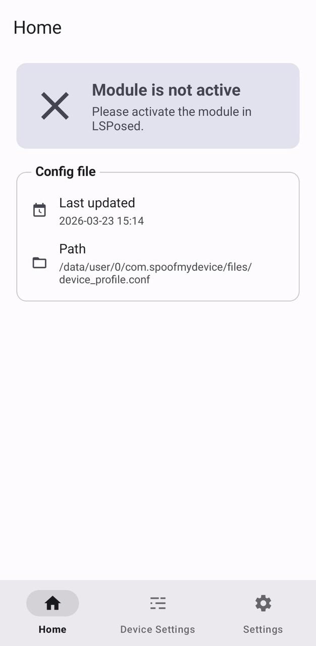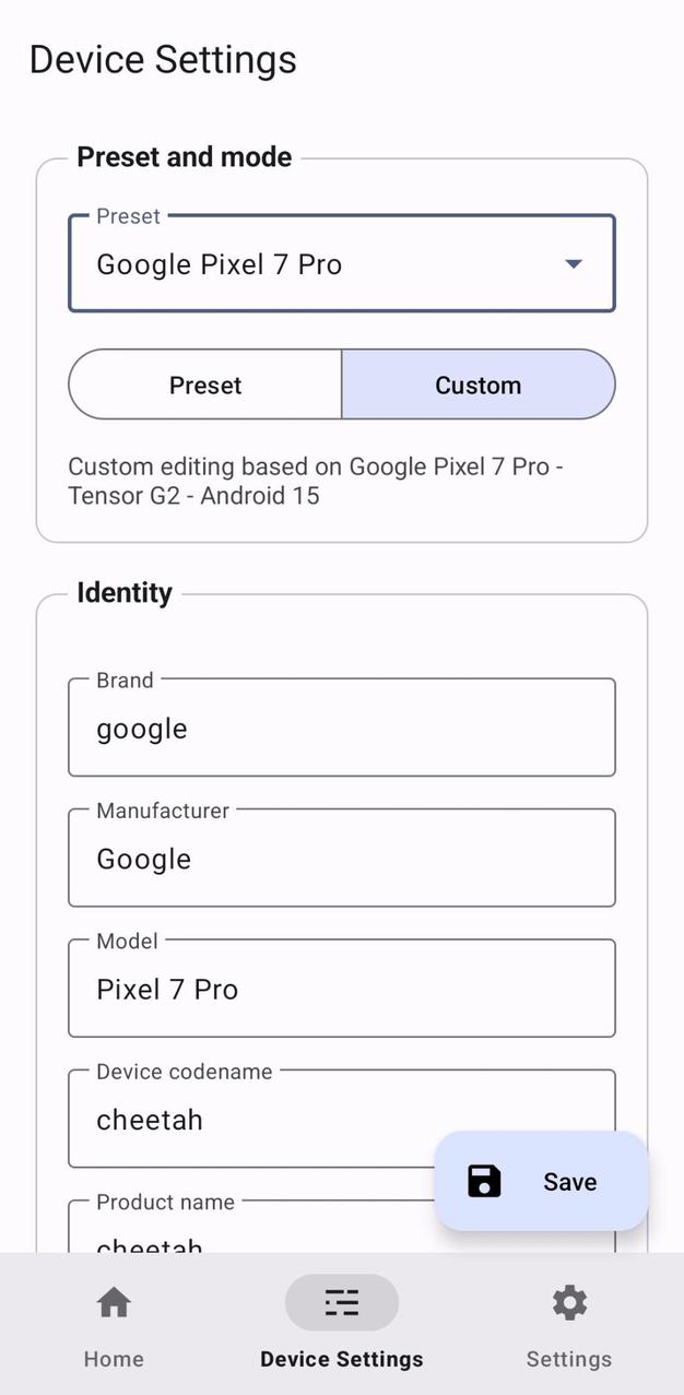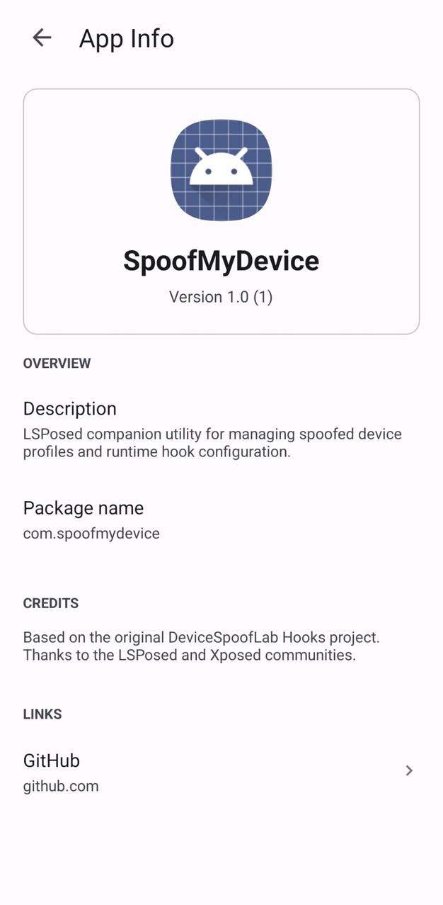 SpoofMyDevice is an LSPosed companion app for building, saving, and applying spoofed Android device profiles.