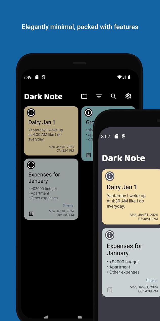 💁 Dark Note is a free, ad-free app for creating notes and checklists, allowing users to track expenses, customize text, add media like photos and audio, and organize entries into folders. The app also offers features such as reminders, pin/fingerprint locking, backup options, and the ability to export notes.